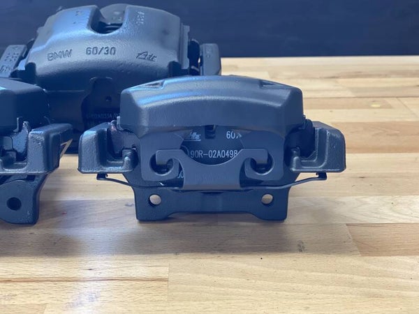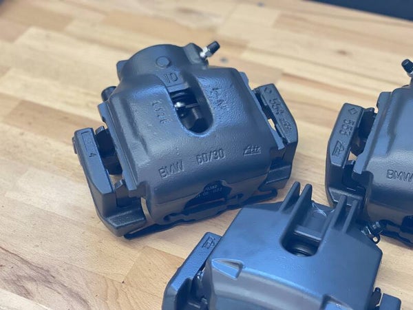 Volledig gereviseerde remklauwen voor een BMW E39. Remklauwen zijn gedemonteerd en geinspecteerd waarna gestraald en gecoat in een 2K lak met RAL kleur 7021.